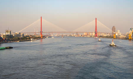 Huangpu river in Shanghai towards Yangpu bridge at sunset