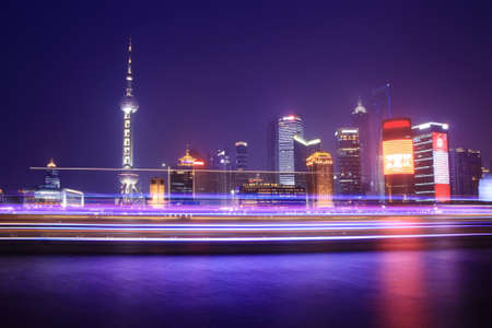 night view of Shanghai with light traces from moving cruise ship