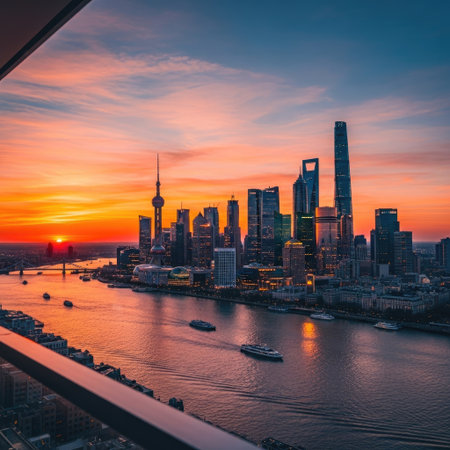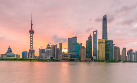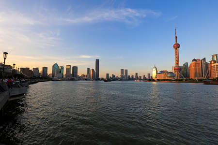 shanghai skyline with sunset glow, huangpu river and pudong skyline, China