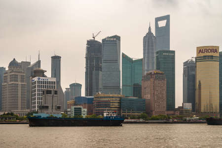 Shanghai, Pudong, Lujiazui, China - May 4, 2010: Skyline of tall buildings under silver-smog-brown sky with World Financial Center as central tower with Huangpu River in front. Large barge on brown water.