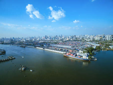 Aerial view container and cargo ship, import export, business logistic supply chain transportation concept and crane at international Port for shipping cargo top view background