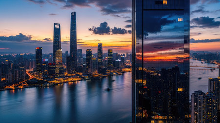 A city skyline glittering with lights reflected in the tranquil waters of a river below, creating a stunning nocturnal panorama of urban beauty and elegance.