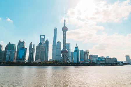 Cityscape view of Shanghai city in the morning. Skyscraper of Lujiazui in Pudong, view from The Bund of Shanghai, China. landmark and popular for tourism attractions. Travel and Vacation concept
