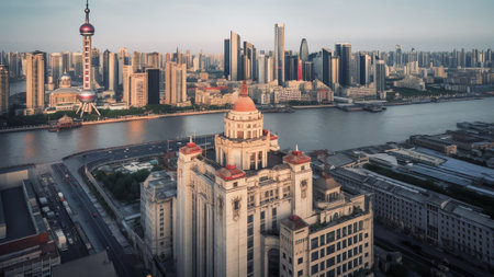 beautiful shanghai in sunset aerial view of the bund and huangpu river