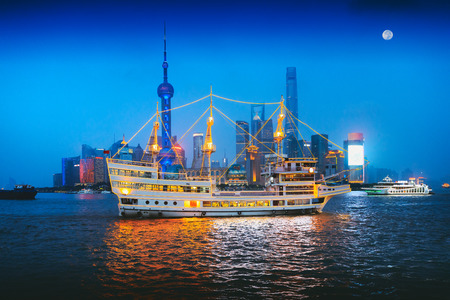 SHANGHAI, CHINA - AUGUST 29, 2016: Twilight view of Shanghai skyline and the Huangpu river against Pudong District, Shanghai, China on August 29, 2016.
