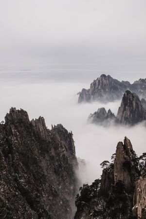 View of clouds and pine tree at mountain peaks of Huangshan National park, China. Landscape of Mount Huangshan of winter season. Site, Anhui China.