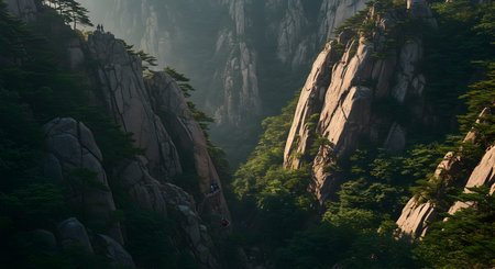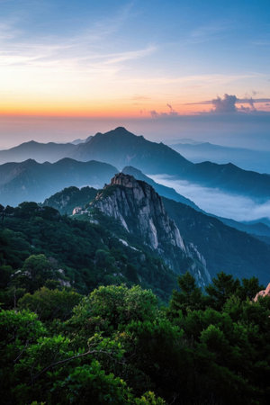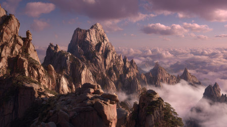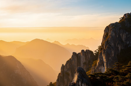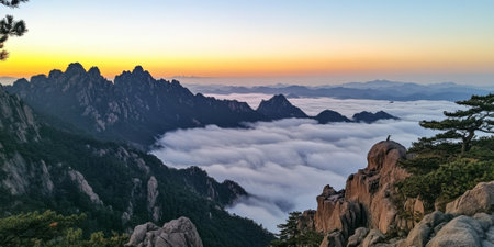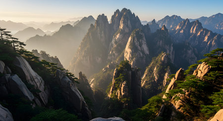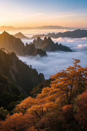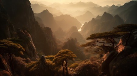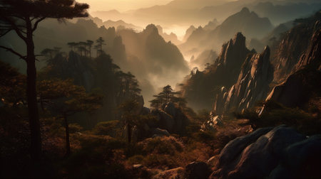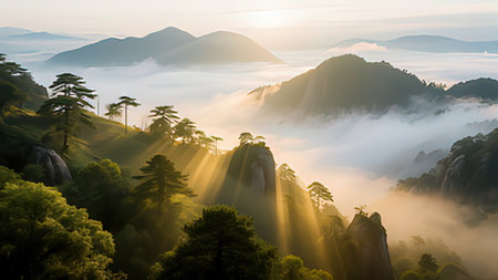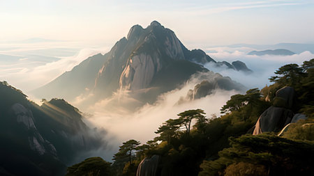 Early morning sunrise in the Huangshan mountains. Magnificent landscape. AI generated.