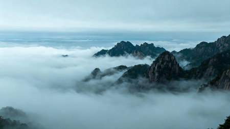 A panoramic view of the Yellow Mountains with mist-covered peaks. No people, copy space.