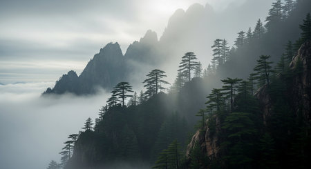 Mist-shrouded mountain natural landscape