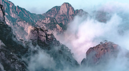 Mist-shrouded mountains, geological wonders