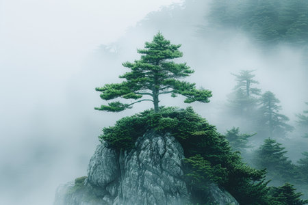 Pine tree against background covered in fog on Wugong Mountain in Jiangxi, China