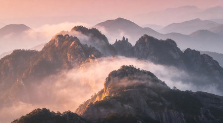 Early morning sunrise in the Huangshan mountains. Magnificent landscape. AI generated