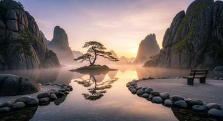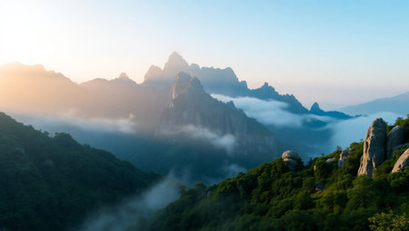 Misty mountain landscape soft fog hues embracing towering peaks in nature s serenity
