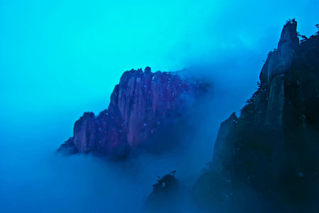 Mountains and clouds in the fog at Huangshan, China.