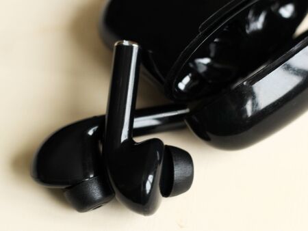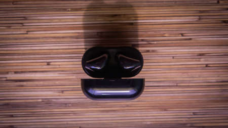 Close up view of black wireless earphones or headphones and black box for storage and charging on wooden table background.