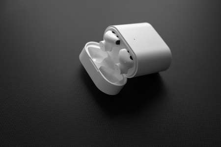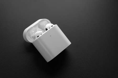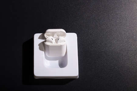 White wireless earphones in charging case on black background with copy space.