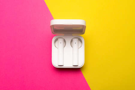 Wireless headphones on a pink background. Bright background. White headphones. Pink and yellow background. Copy space. An article about technology. Modern technologies.