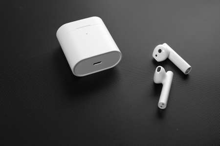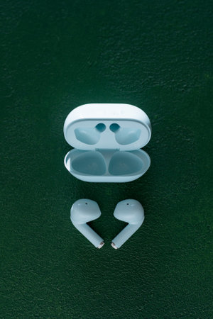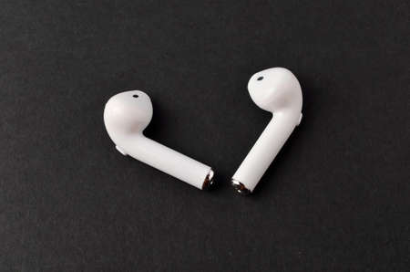 Pair of white wireless earbuds for smartphone. Relaxation concept.