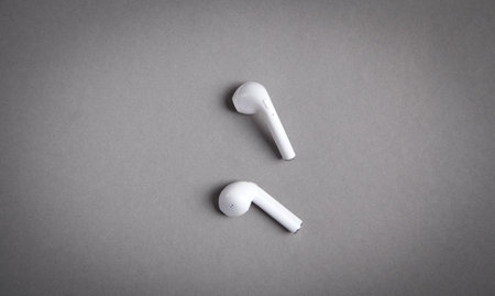 White wireless earphones on the gray background.