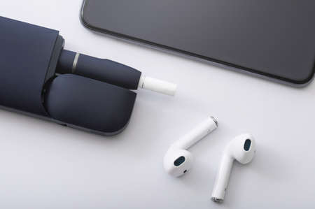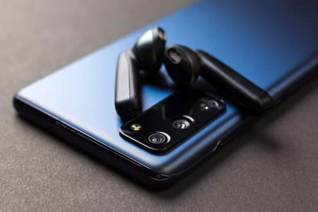 A new smartphone with wireless headphones on gray background, Close-up.