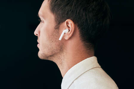 Closeup side view of serious young handsome man posing with wireless earphones on white studio background. Caucasian businessman using wireless earbuds. People, technology and business concept