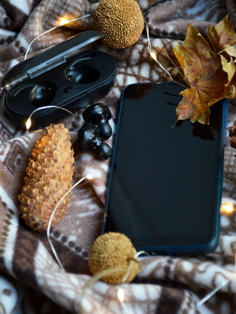 smartphone and wireless headphones on a background of pine cones and a yellow garland. autumn still life. music, cinema and learning on calm autumn evenings. wireless technologies