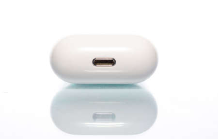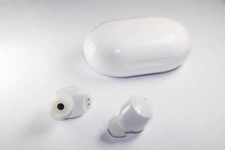 Wireless ear buds in glossy white plastic case on white background, close-up. Place for text, copyspace.