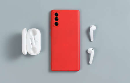Smartphone with red cover and white wireless earphones top view on grey background
