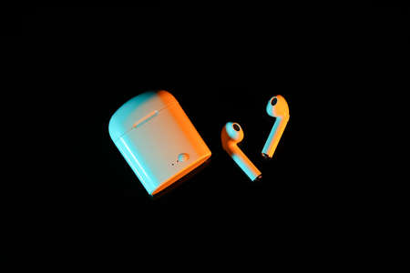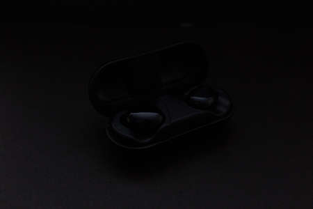 Modern wireless earphones on dark background
