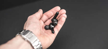 A hand holding Blank wireless earphones on black background