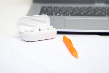 Wireless headphones, an orange pen and a laptop on the table.