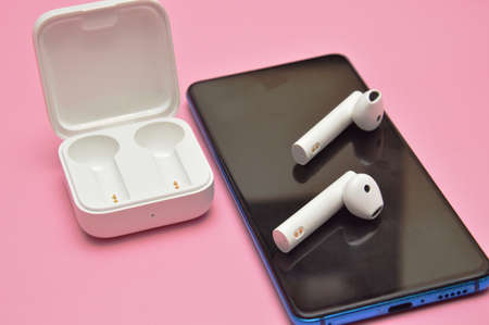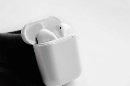 Wireless headphones connected to a phone or smartphone via the network. Small wireless music portable acoustics, white headphones.