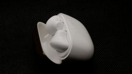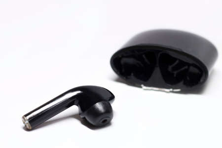 Close up of white TWS (true wireless stereo) isolated on black background