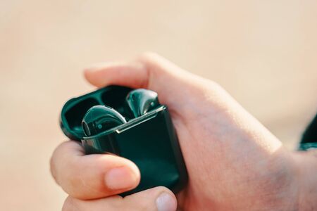 Man holding wireless earphones in charging box