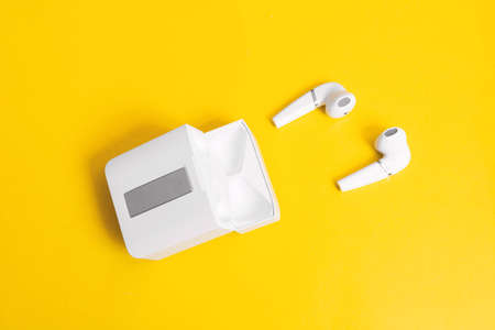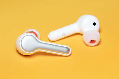Wireless earbuds on a yellow background close up