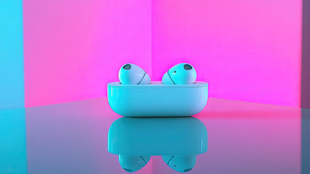 Stylish Bluetooth earbuds placed in a sleek charging case against a vibrant backdrop. Ideal for showcasing modern technology, music enjoyment, and lifestyle.