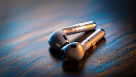 Close up image of wireless earbuds on a table, symbolizing technology, convenience, and modern lifestyle.