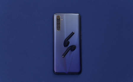 Modern smartphone with wireless earphones on classic blue background. Color 2020. Top view. flat lay