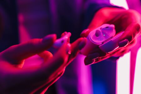Cropped image of young woman posing over neon lights holding wireless earphones with case.