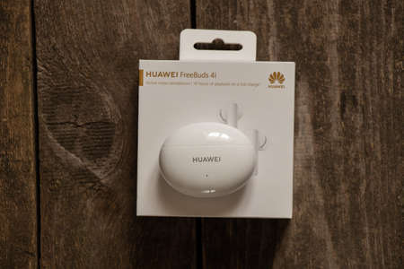 Ukraine Dnepr 08.10.2021 - Headphones Huawei FreeBuds 4i White new with packaging lie on a wooden table, wireless headphones