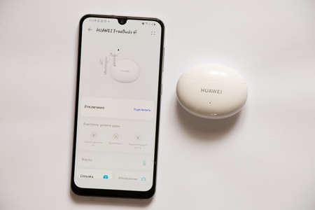 Ukraine Dnipro 10/08/2021 - New Huawei FreeBuds 4i White headphones in the package lie on a white background next to the phone and open mobile applications for headphones, wireless headphones and applications