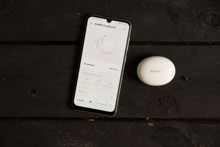 Ukraine Dnipro 10/08/2021 - New Huawei FreeBuds 4i White headphones in the package lie on a wooden table next to the phone and open mobile apps for headphones, wireless headphones and apps