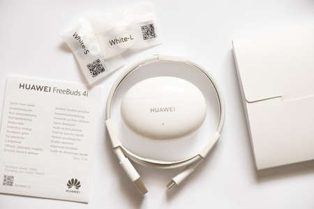Ukraine Dnepr 08.10.2021 - Headphones Huawei FreeBuds 4i (White) new with packaging lie on a white background, wireless headphones