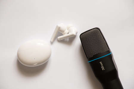 case with wireless earphones in the shape of an oval and earphones lies lying around a microphone on an isolated background, wireless earphones, music