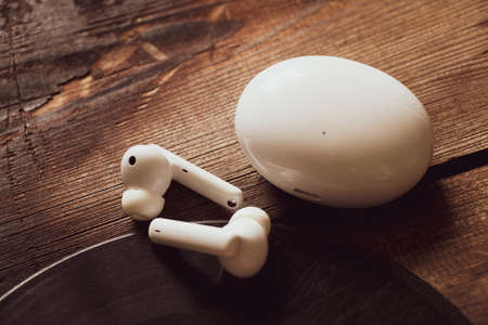 Wireless headphones and a charging case lie on a wooden table on a vinyl record, music and hobbies