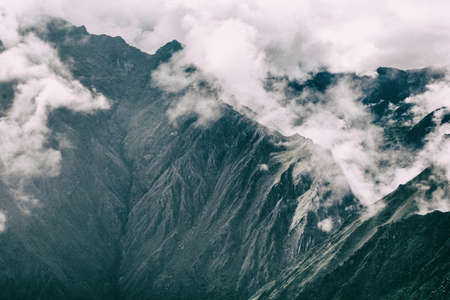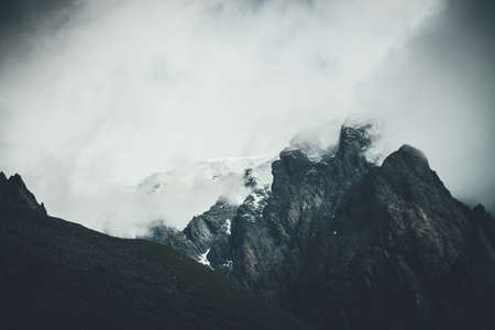 Dark atmospheric surreal landscape with dark rocky mountain top in low clouds in gray cloudy sky. Gray low cloud on high pinnacle. High black rock with snow in low clouds. Surrealist gloomy mountains.