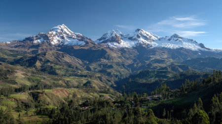 Majestic snow-capped mountain range dominates the background of this image. Lush green vegetation and trees fill the foreground, creating a vibrant contrast. The clear blue sky and scattered clouds complete the picturesque scene.