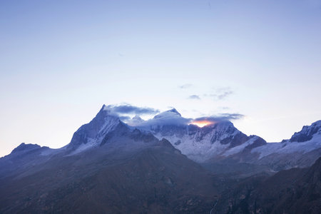 cordillera blanca trail huayhuash, mountain top by sunset getting red.