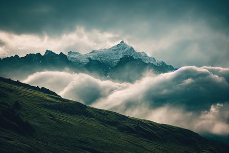 Dense clouds separate the snow-covered mountains and the green valley. 3D illustration