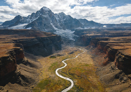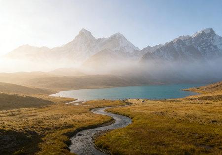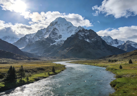 An AI generated illustration of A mountainous landscape with a snow-capped peak